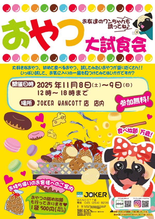 建物内はわんちゃんを降ろして歩くことができます。 ジョーカーへわんちゃんと一緒にご来店いただくと、ウェルカムおやつをお渡ししていますので、スタッフまでお声がけください。